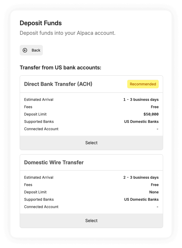 • Alpaca will present options for transferring from US bank accounts. Select the recommended option: Direct Bank Transfer (ACH).