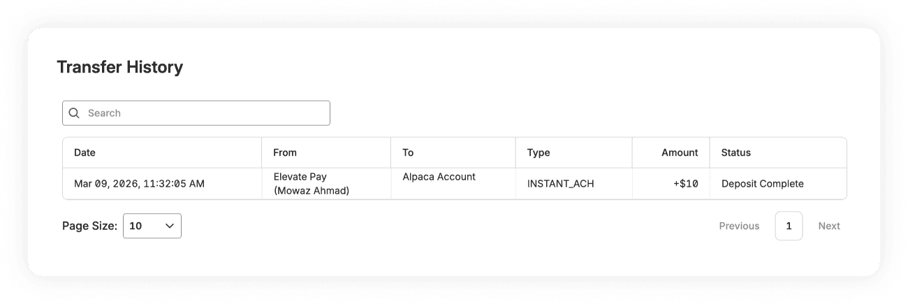 • The transfer will appear with the type "INSTANT_ACH", and the status will show as Deposit Complete once the funds have successfully moved from your Elevate Pay account to Alpaca.