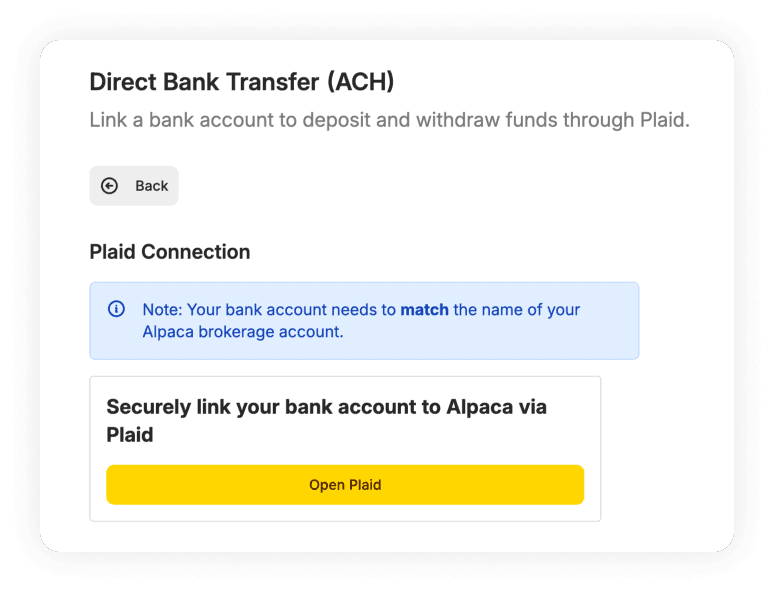 Using Plaid allows instant verification so you can fund your Alpaca account faster and start investing without waiting for micro-deposits.