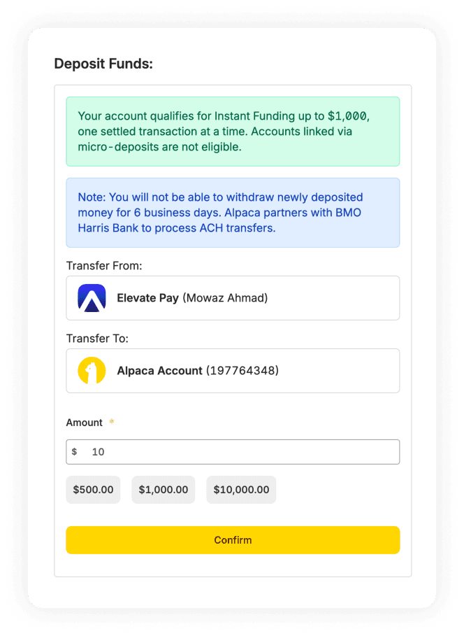 • On the Deposit Funds screen, confirm that the "Transfer From" is your linked Elevate Pay account and the "Transfer To" is your Alpaca Account.