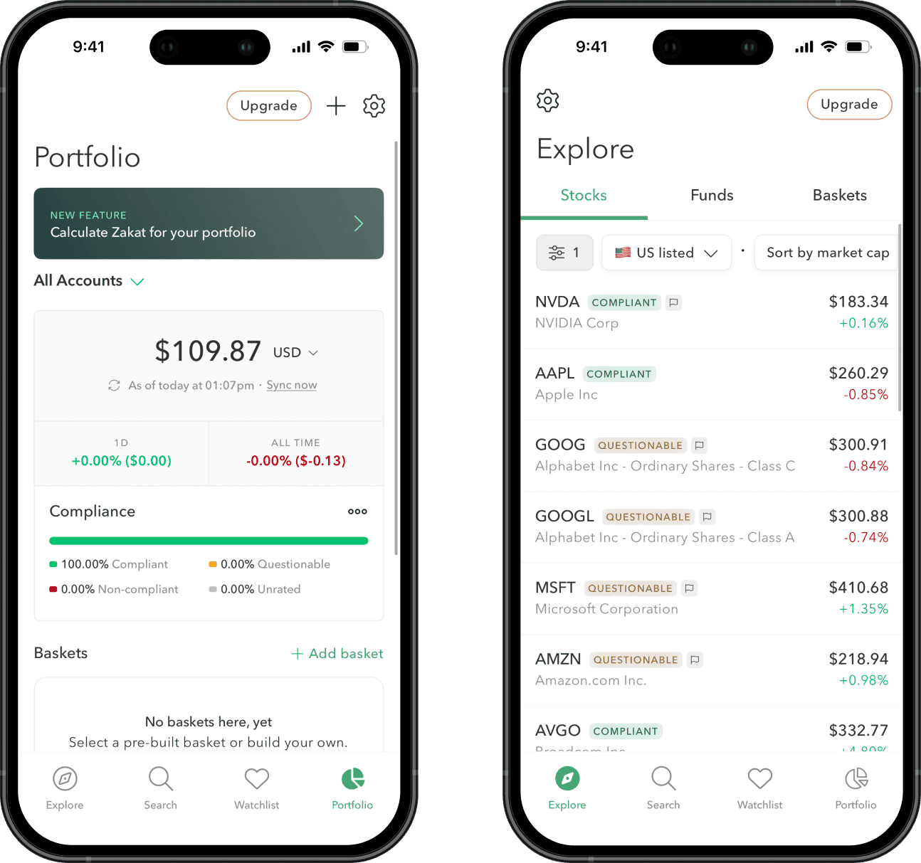 You aren't just limited to tracking existing holdings. Use Zoya’s Explore or Search tabs to look up individual stocks or ETFs before making a move. You can instantly verify if an asset is Shariah-compliant. Once you find a stock that fits your strategy, simply log into IBKR to execute the trade.