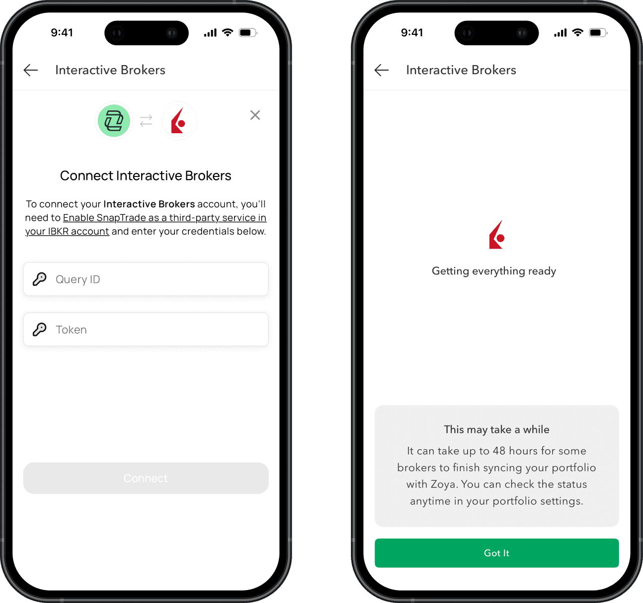 Hit “Continue” to begin connecting Zoya with IBKR via SnapTrade.